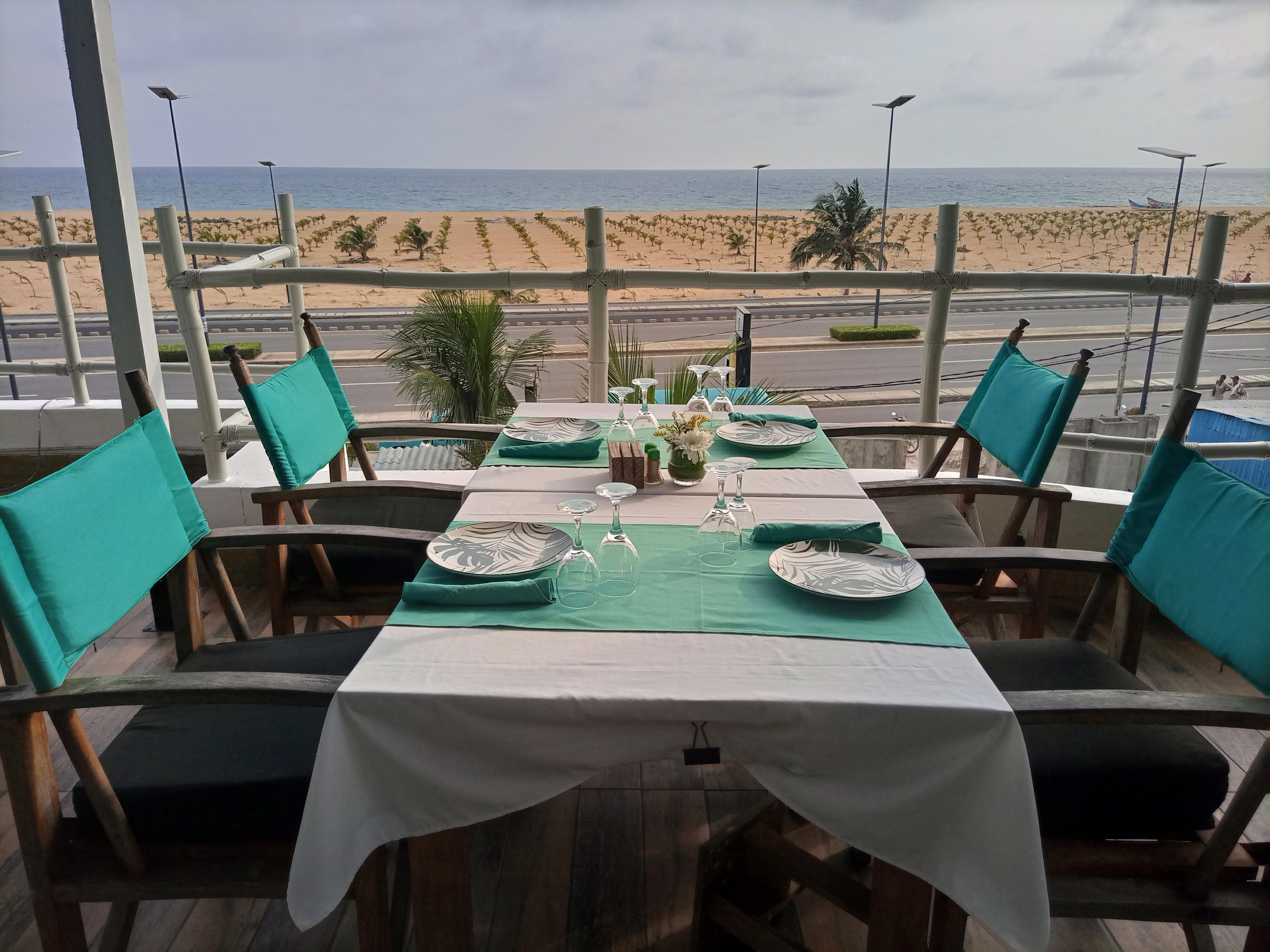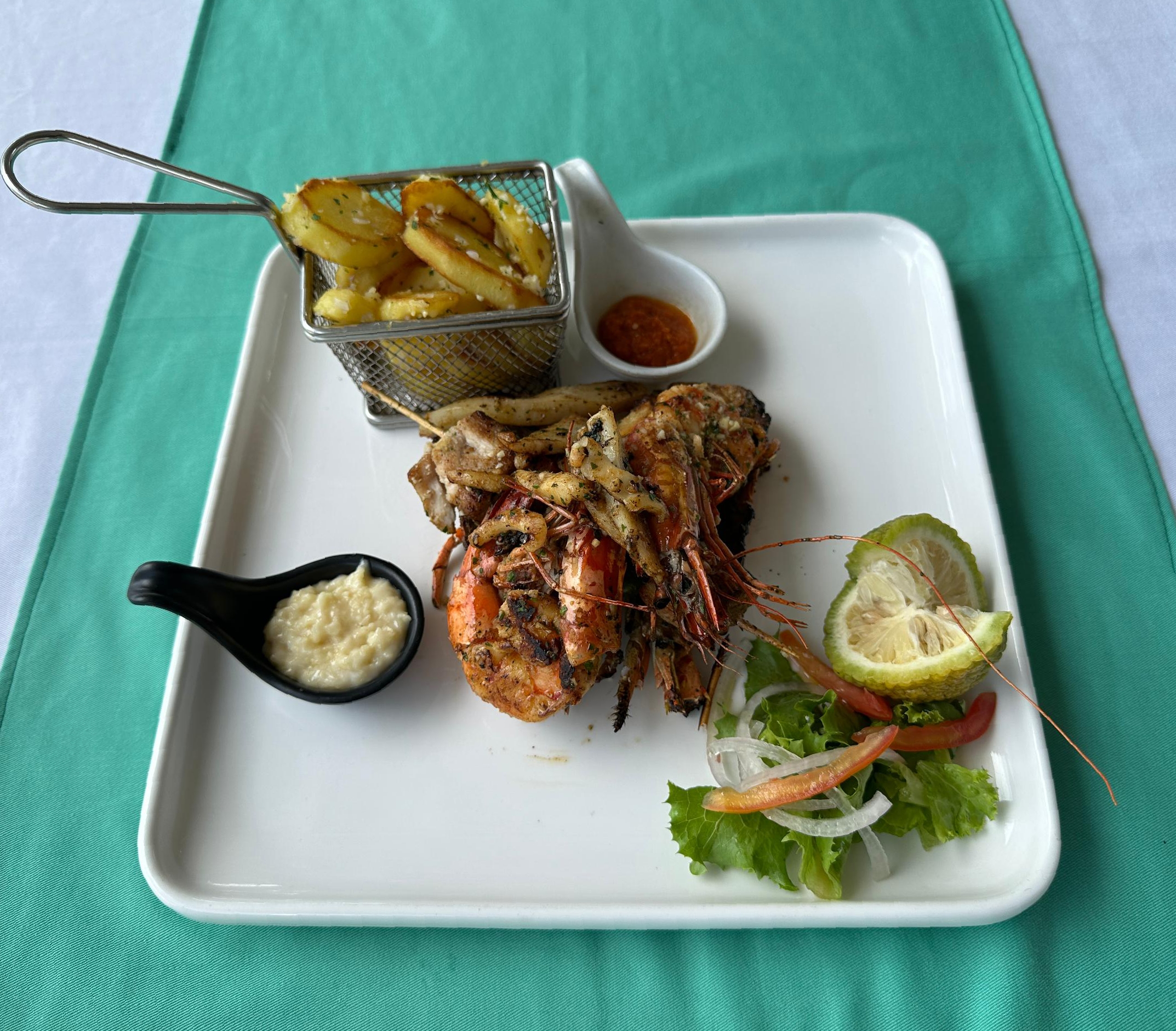 Réservation effectuée la veille pour déjeuner à 14 heures sur le roof top de l’hôtel très aéré et protégé du soleil par une magnifique bâche qui couvre la totalité du restaurant. Au menu des fruits de mer d’une fraîcheur remarquable, cigale de mer et gambas...